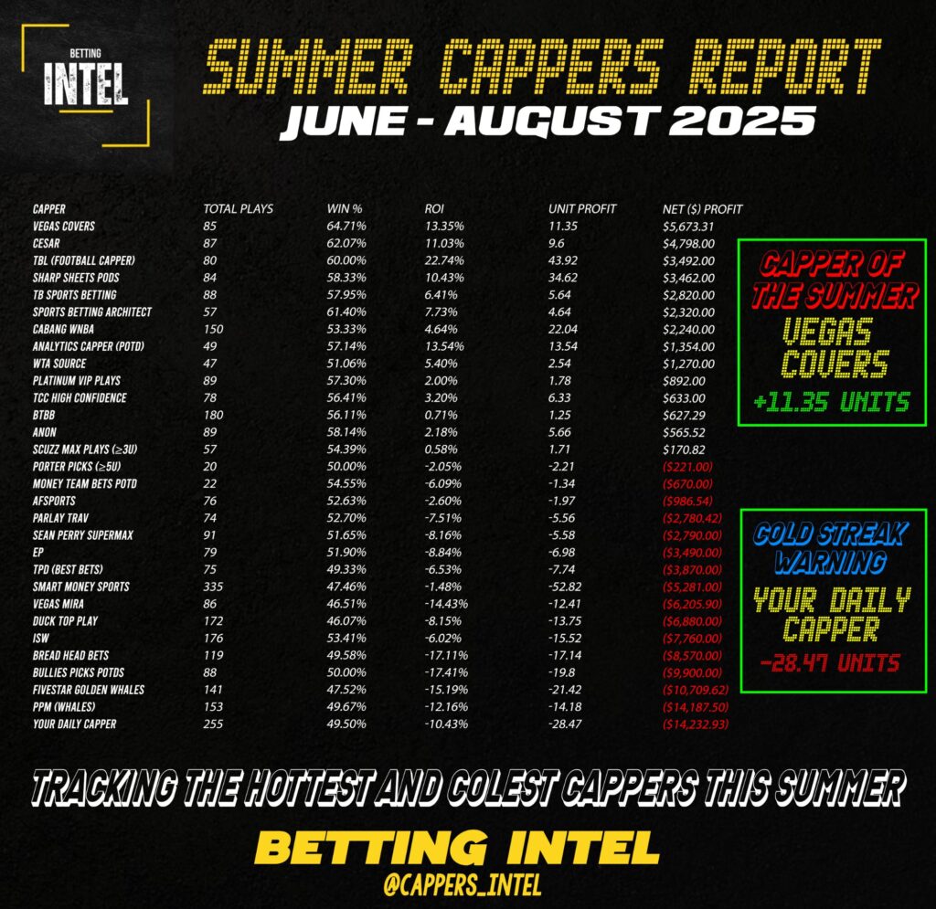All data sourced from Betting Intel’s Summer Cappers Report (June–August 2025).