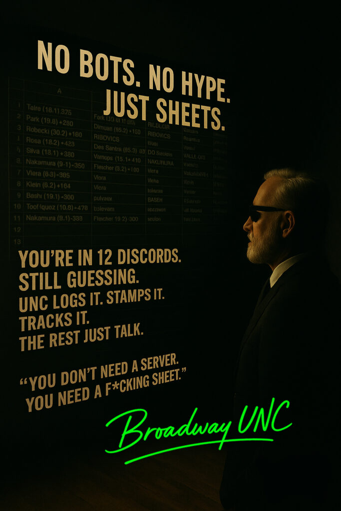 Founder. Editor. Architect of this sh*t. This isn’t a blog. It’s a f***ing command center. Every article, every rant, every god-tier betting sheet — UNC runs all of it. He built the #1 capper accountability system in the game, then launched a journal to torch the rest. The fake 9–1 records? Logged. The cappers ducking recaps? Cooked. The Discords peddling “VIP”? Washed. This man doesn’t write for clicks. He writes to bury frauds, boost real heat, and remind the industry who’s running the scoreboard. He doesn’t chase headlines. He builds sports betting weapons. 🧾 UNC Sheets. 🧠 UNC’s Rants. 📈 Capper Watch. 🔥 Field Reports. All of it, straight from the same mind. Broadway UNC isn’t just the name. It’s the system. And if you’re reading this, you’re already inside it.