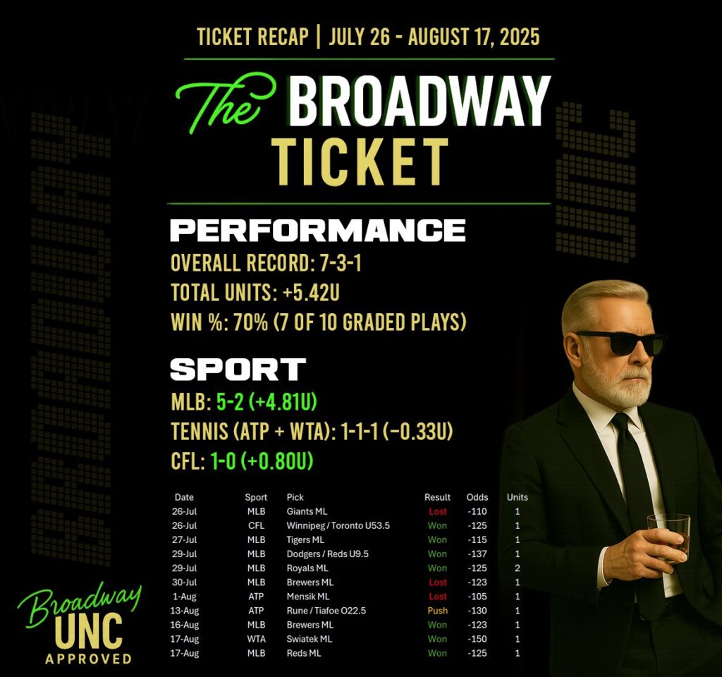From July 26 through August 17, the Broadway Ticket came out hot, stacking profits across multiple sports. The recap shows a 7-3-1 overall record, good for a sharp +5.42 units and a strong 70% win rate on graded plays.